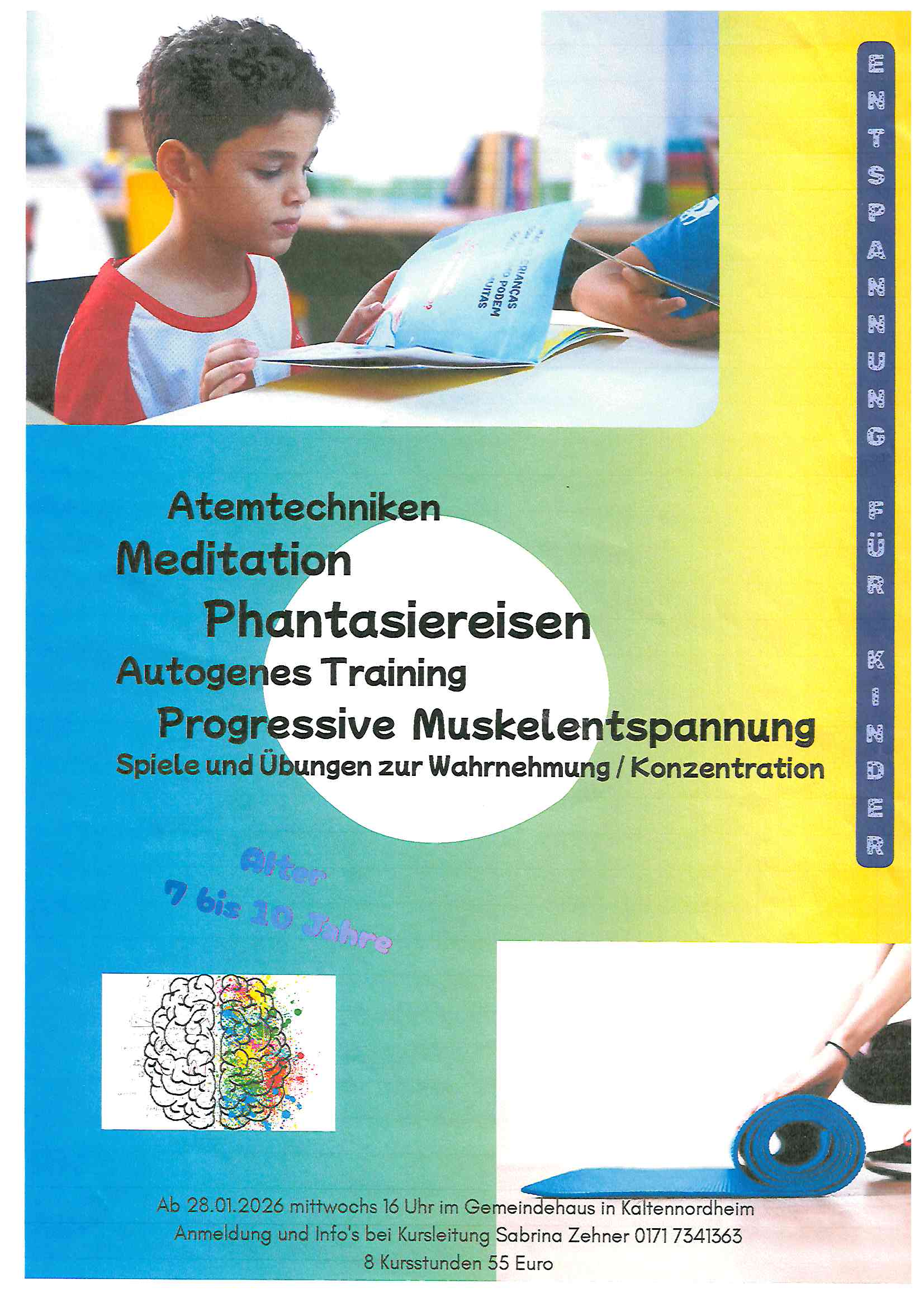 Published in: Allgemein „Autogenes Training/Atemtechniken etc. – Kurs für Kinder 7-10 Jahre“ ab 28.01.2026 – mittwochs, ab 16.00 Uhr im Gemeindehaus Kaltennordheim (mit Anmeldung) Author nmueller Published on: 19. Dezember 2025