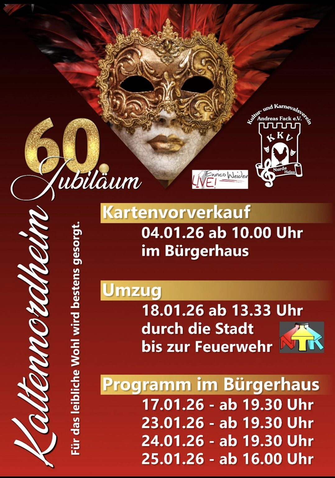 „60 Jahre Karneval Kaltennordheim“ – Kartenvorverkauf am 04.01.2026, ab 10.00 Uhr im Bürgerhaus Kaltennordheim SuchenSuchenNeueste BeiträgeSprechzeiten der Büros über die Feiertage Stellenausschreibung Erzieher/in (PIA) Ausbildung Sitzung des Stadtrates Kaltennordheim am 16.12.2025, 18.00 Uhr, im DGH Kaltenlengsfeld, Umpfenblick 2 Stellenausschreibung Energiemanager Ortsteilratssitzung Unterweid am 09.12.2025 Neueste KommentareEs sind keine Kommentare vorhanden.