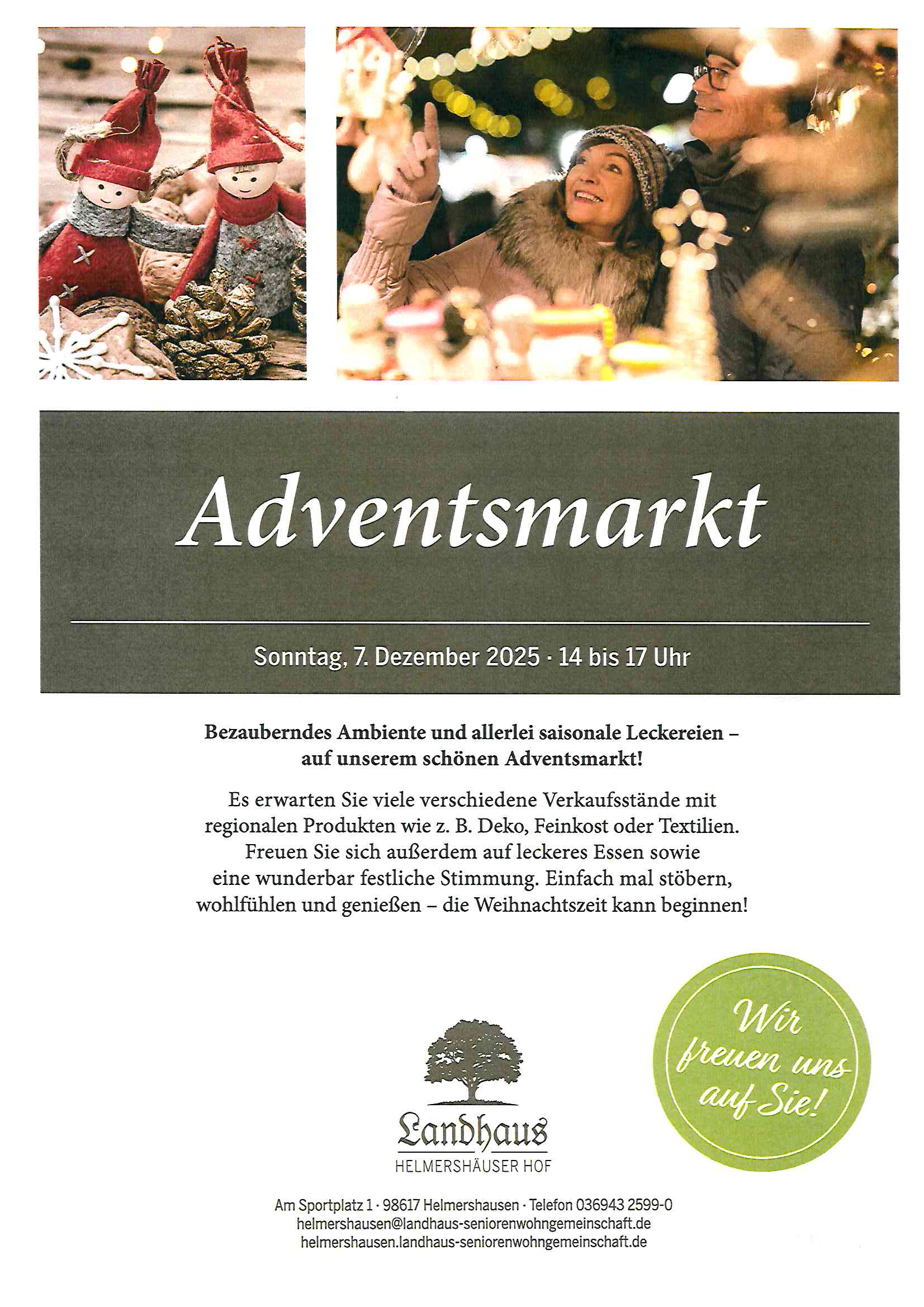 Es erwarten Sie viele verschiedene Verkaufsstände mit regionalen Produkten. Freuen Sie sich außerdem auf leckeres Essen sowie eine wunderbar festliche Stimmung. Einfach mal stöbern, wohlfühlen und genießen – die Weihnachtszeit kann beginnen!