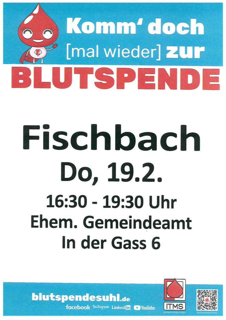Blutspende im Fischbach am Donnerstag, dem 19.02.2026, 16.30-19.30, im ehem. Gemeindeamt „In der Gass 6“ SuchenSuchenNeueste BeiträgeVerpflichtung zur Aufklärung der Bevölkerung zur Organ- und Gewebespende nach § 2 Absatz 1 Transplantationsgesetz (TPG) Sitzung Bauausschuss der Stadt Kaltennordheim am Montag, 26.01.2026, 18.30 Uhr, Sitzungszimmer der VG Hohe Rhön in Kaltensundheim Veranstaltungsreihe „Studium und Beruf“ 2026 in der Ferienwoche vom 16. bis 20. Februar 2026 in der Agentur für Arbeit in Suhl Partnerschaftstreffen im Jahr 2025 „Autogenes Training/Atemtechniken etc. – Kurs für Kinder 7-10 Jahre“ ab 28.01.2026 – mittwochs, ab 16.00 Uhr im Gemeindehaus Kaltennordheim (mit Anmeldung) Neueste KommentareEs sind keine Kommentare vorhanden.