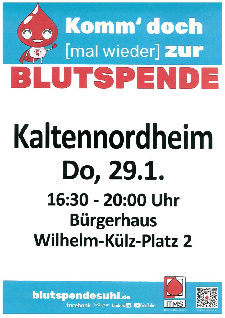 Blutspende in Kaltennordheim am 29.01.2026, 16.30-20.00 Uhr im Bürgerhaus SuchenSuchenNeueste BeiträgeStellenausschreibung Erzieher/in (PIA) Ausbildung Sitzung des Stadtrates Kaltennordheim am 16.12.2025, 18.00 Uhr, im DGH Kaltenlengsfeld, Umpfenblick 2 Stellenausschreibung Energiemanager Ortsteilratssitzung Unterweid am 09.12.2025 Beitragssatzung 2026 der Tierseuchenkasse Neueste KommentareEs sind keine Kommentare vorhanden.