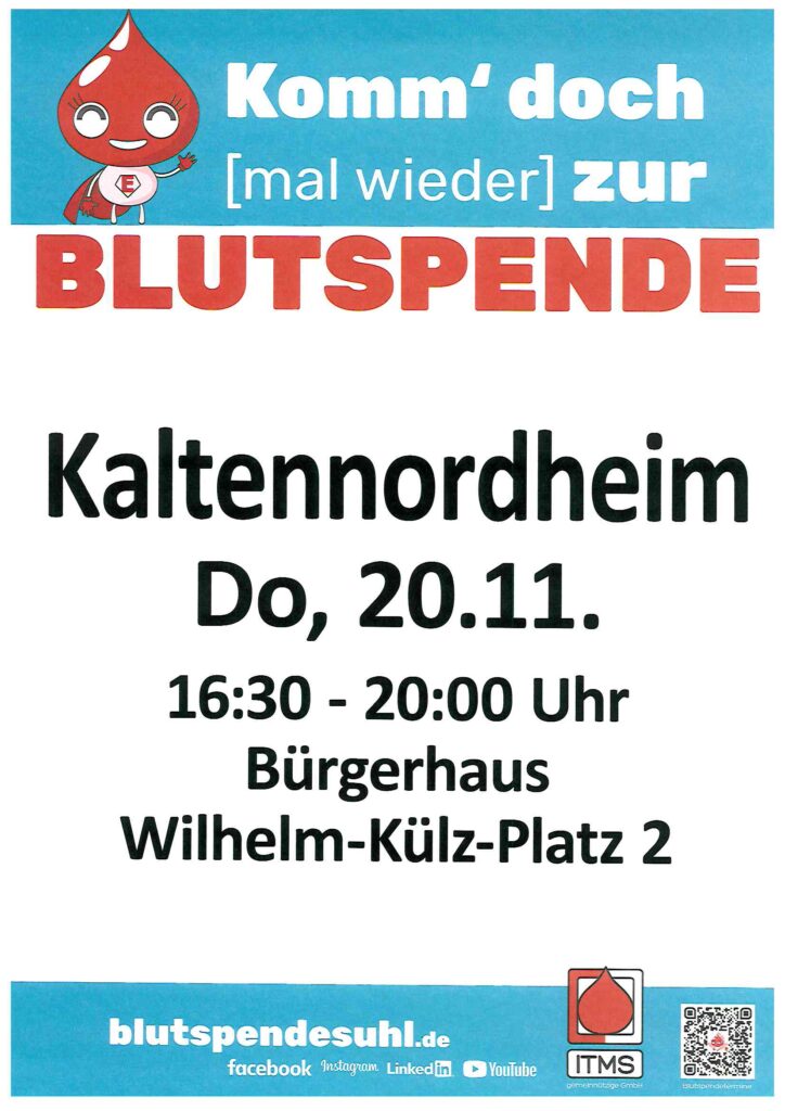 Blutspende in Kaltennordheim am Donnerstag, 20.11.2025, 16.30-20.00 Uhr, im Bürgerhaus SuchenSuchenNeueste BeiträgeAb Montag, 27.10.2025, Wegebauarbeiten im „Stätteweg“ Kaltennordheim Gemeindesprechstunde „Pflegestützpunkt“ im Rathaus Kaltennordheim am 23.10.2025 (mit Voranmeldung über das LRA) Ferienangebote der Caritas für 2026 Die digitale Rentenübersicht Information zur Umsetzung von Gehölzpflanzungen am Goldbach zwischen Kaltenlengsfeld und Kaltennordheim ab Ende Oktober/Anfang November 2025 Neueste KommentareEs sind keine Kommentare vorhanden.