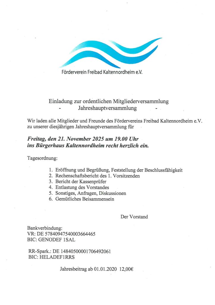Jahreshauptversammlung Schwimmbadverein Kaltennordheim am 21.11.2025, 19.00 Uhr, im Bürgerhaus Kaltennordheim SuchenSuchenNeueste BeiträgeAb Montag, 27.10.2025, Wegebauarbeiten im „Stätteweg“ Kaltennordheim Gemeindesprechstunde „Pflegestützpunkt“ im Rathaus Kaltennordheim am 23.10.2025 (mit Voranmeldung über das LRA) Ferienangebote der Caritas für 2026 Die digitale Rentenübersicht Information zur Umsetzung von Gehölzpflanzungen am Goldbach zwischen Kaltenlengsfeld und Kaltennordheim ab Ende Oktober/Anfang November 2025 Neueste KommentareEs sind keine Kommentare vorhanden.