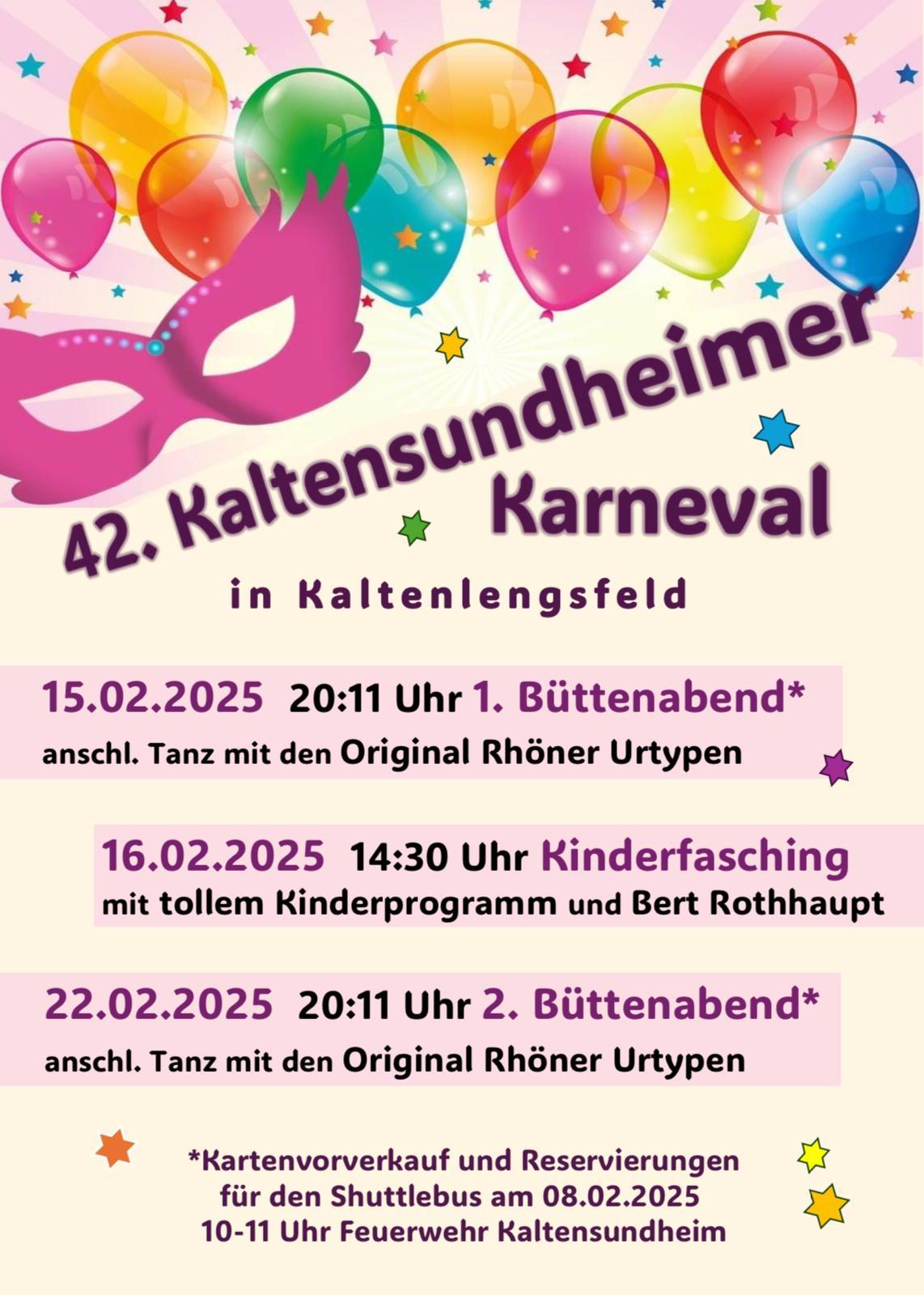 Kaltesundheimer Karneval am 15.02. und 16.02.2025 sowie am 22.02.2025 im DGH Kaltenlengsfeld SuchenSuchenNeueste BeiträgeAb Montag, 27.10.2025, Wegebauarbeiten im „Stätteweg“ Kaltennordheim Ferienangebote der Caritas für 2026 Die digitale Rentenübersicht Information zur Umsetzung von Gehölzpflanzungen am Goldbach zwischen Kaltenlengsfeld und Kaltennordheim ab Ende Oktober/Anfang November 2025 Familienfonds des Landkreises Schmalkalden-Meiningen Neueste KommentareEs sind keine Kommentare vorhanden.