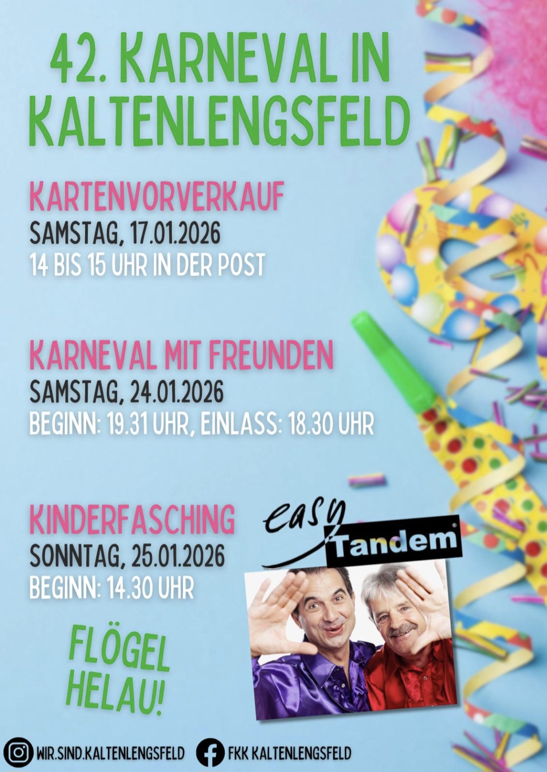 Kartenvorverkauf für den 42. Karneval in Kaltenlengsfeld am 17.01.2026 – 14.00 bis 15.00 Uhr in der „Post“ am Brandplatz in Kaltenlengsfeld SuchenSuchenNeueste Beiträge„Autogenes Training/Atemtechniken etc. – Kurs für Kinder 7-10 Jahre“ ab 28.01.2026 – mittwochs, ab 16.00 Uhr im Gemeindehaus Kaltennordheim (mit Anmeldung) Sprechzeiten der Büros über die Feiertage Stellenausschreibung Erzieher/in (PIA) Ausbildung Sitzung des Stadtrates Kaltennordheim am 16.12.2025, 18.00 Uhr, im DGH Kaltenlengsfeld, Umpfenblick 2 Stellenausschreibung Energiemanager Neueste KommentareEs sind keine Kommentare vorhanden.