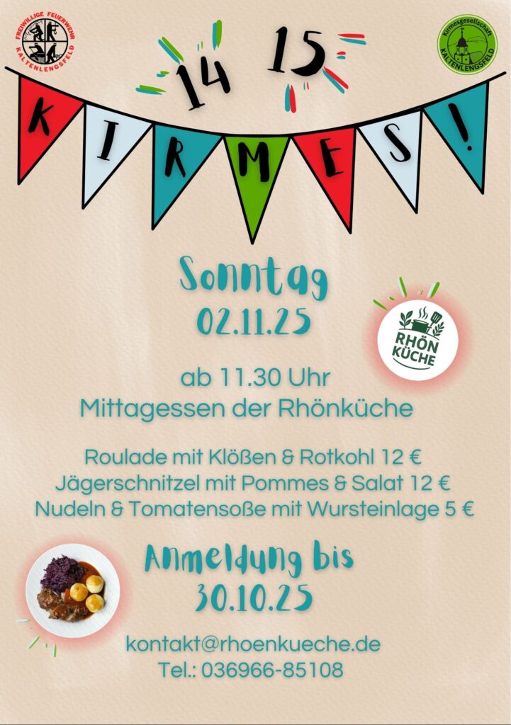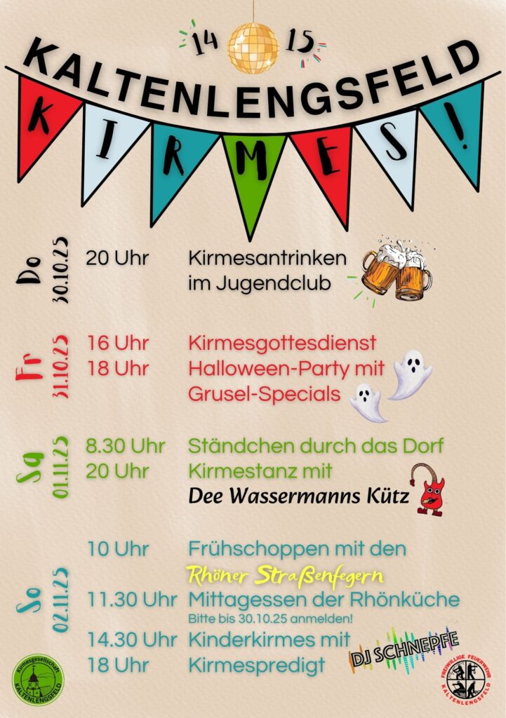 Der Feuerwehrverein und die Kirmesgesellschaft laden vom 30. Oktober bis zum 2. November 2025 herzlich zur traditionellen Saalkirmes ins Dorfgemeinschaftshaus Kaltenlengsfeld ein.