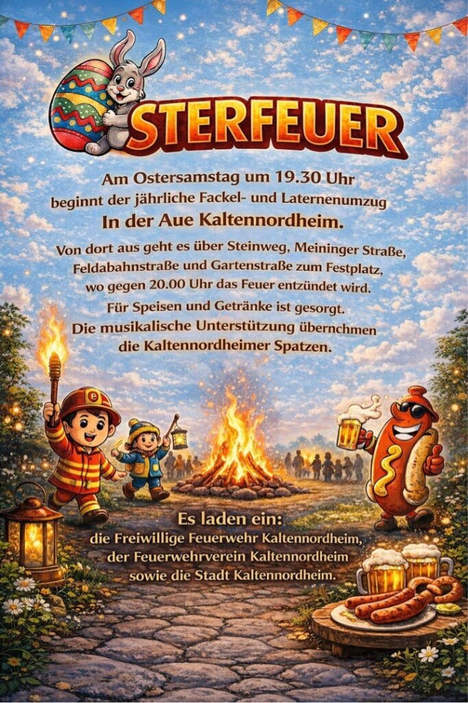 Osterfeuer in Kaltennordheim am Ostersamstag, 04.04.2026, ab 19.30 Uhr SuchenSuchenNeueste BeiträgeBiZ-Veranstaltungen vom 14.04.2026 bis 10.06.2026 Aktuelle Informationen – Partnerschaftsverein Sitzung der Gemeinschaftsversammlung der VG Hohe Rhön am 30.03.2026, 18.30 Uhr, im Dorfgemeinschaftshaus Oberweid (Feierraum) Sitzung des Stadtrates Kaltennordheim am Dienstag, 31.03.2026, 18.30 Uhr, im Bürgerhaus Kaltennordheim Öffnung – Erlebniswelt Rhönwald Neueste KommentareEs sind keine Kommentare vorhanden.