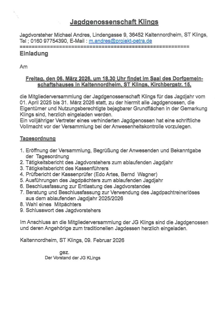 Sitzung Jagdgenossenschaft Klings am Freitag, dem 06.03.2026, 18.30 Uhr, im DGH Klings SuchenSuchenNeueste BeiträgeOrtsteilratssitzung in Kaltenlengsfeld am 12.02.2026, 19.00 Uhr im DGH Wohnungsanzeige Mietwohnung Nordstraße 7 Erdgeschoss links Sitzung Wahlausschuss am 10.02.2026, 17.30 Uhr, in der VG Kaltensundheim – Zulassung Wahlvorschläge BGM-Kano 2026 Ortsteilratssitzung Kaltensundheim am 05.02.2026 Ortsteilratssitzung Kaltennordheim am Montag, 02.02.2026, 19.30 Uhr im Bürgerhaus Kaltennordheim Neueste KommentareEs sind keine Kommentare vorhanden.