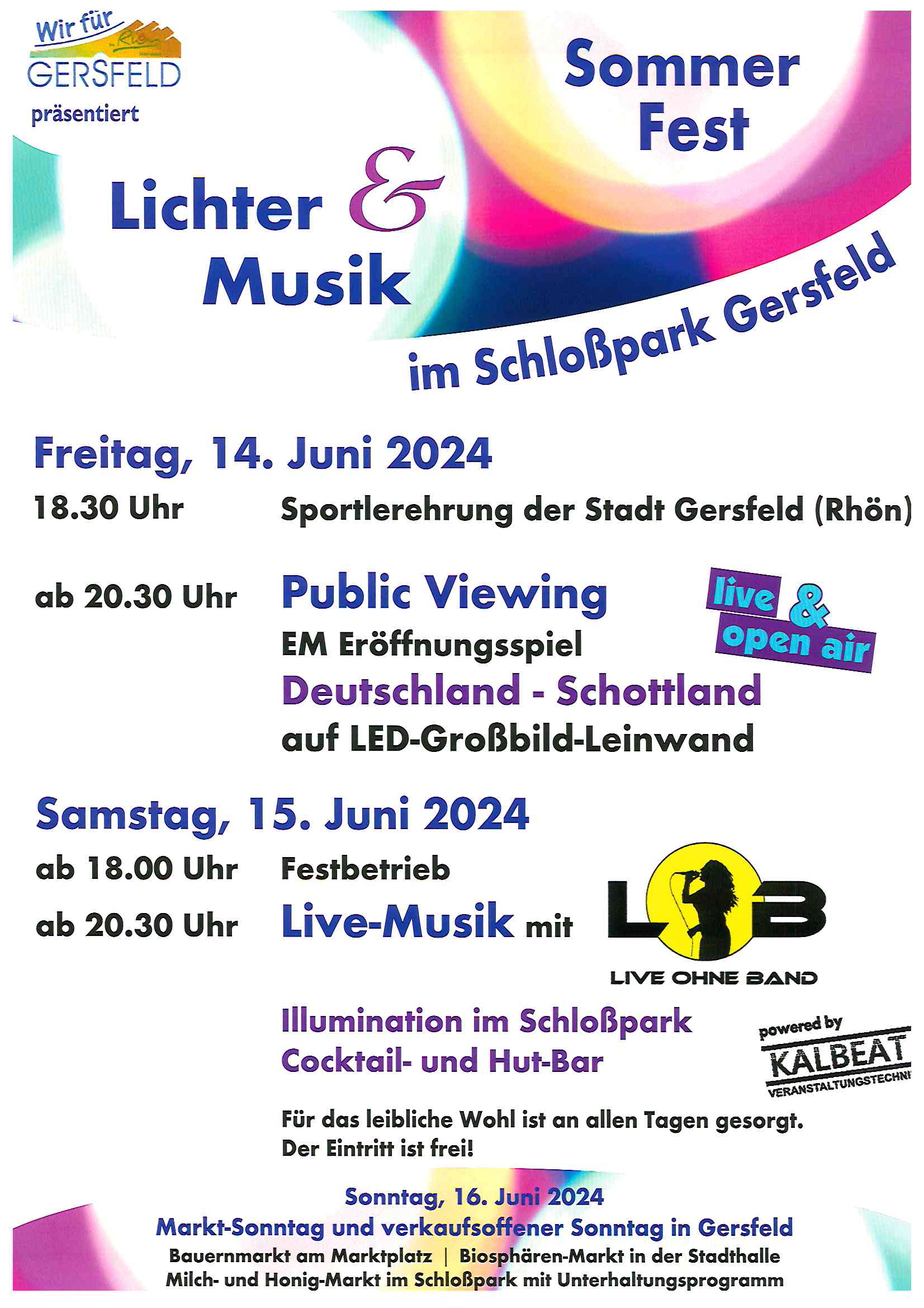 Sommerfest in Gersfeld vom 14.06.2024 bis 16.06.2024 SuchenSuchenNeueste BeiträgeAb Montag, 27.10.2025, Wegebauarbeiten im „Stätteweg“ Kaltennordheim Ferienangebote der Caritas für 2026 Die digitale Rentenübersicht Information zur Umsetzung von Gehölzpflanzungen am Goldbach zwischen Kaltenlengsfeld und Kaltennordheim ab Ende Oktober/Anfang November 2025 Familienfonds des Landkreises Schmalkalden-Meiningen Neueste KommentareEs sind keine Kommentare vorhanden.