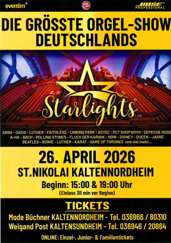 „Starlights“ die größte Orgel-Schow am 24.06.2026 in der St. Nikolai-Kirche in Kaltennordheim SuchenSuchenNeueste BeiträgeStadtratssitzung am Donnerstag, 05.03.2026, 18.30 Uhr, im Bürgerhaus Kaltennordheim Ortsteilratssitzung Kaltensundheim am 03.03.2026 „Tag der sozialen Berufe“ am Samstag, 28.02.2026, 10.-13.00 Uhr in Eisenach, Evangelische Schule für soziale Berufe neuer Pächter für „Weidberg-Imbiss“ in der Erlebniswelt Rhönwald/Arche Rhön gesucht Neuverpachtung Gasthaus „Zum Hirsch“ in Kaltennordheim Neueste KommentareEs sind keine Kommentare vorhanden.