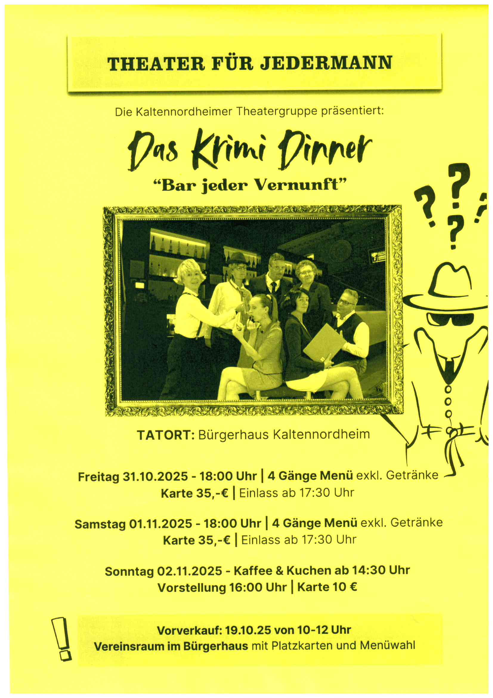 Theater im Bürgerhaus Kaltennordheim – „Das Krimi Dinner“ – am 31.10.2025, 01.11.2025 und 02.11.2025 SuchenSuchenNeueste BeiträgeAb Montag, 27.10.2025, Wegebauarbeiten im „Stätteweg“ Kaltennordheim Ferienangebote der Caritas für 2026 Die digitale Rentenübersicht Information zur Umsetzung von Gehölzpflanzungen am Goldbach zwischen Kaltenlengsfeld und Kaltennordheim ab Ende Oktober/Anfang November 2025 Familienfonds des Landkreises Schmalkalden-Meiningen Neueste KommentareEs sind keine Kommentare vorhanden.