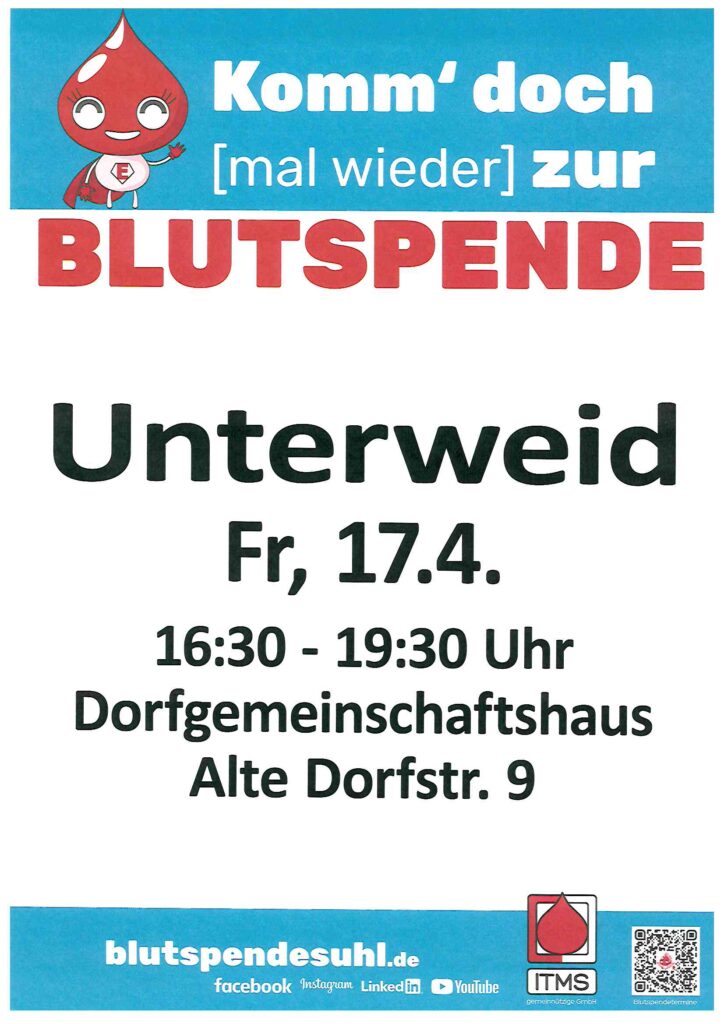 Blutspende: Unterweid, Dorfgemeinschaftshaus am 17.04.2026 (16:30-19:30 Uhr) SuchenSuchenNeueste BeiträgeBiZ-Veranstaltungen vom 14.04.2026 bis 10.06.2026 Aktuelle Informationen – Partnerschaftsverein Sitzung der Gemeinschaftsversammlung der VG Hohe Rhön am 30.03.2026, 18.30 Uhr, im Dorfgemeinschaftshaus Oberweid (Feierraum) Sitzung des Stadtrates Kaltennordheim am Dienstag, 31.03.2026, 18.30 Uhr, im Bürgerhaus Kaltennordheim Öffnung – Erlebniswelt Rhönwald Neueste KommentareEs sind keine Kommentare vorhanden.