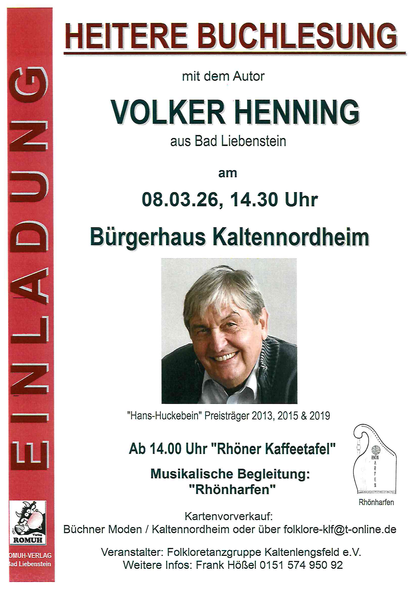 Am 08.03.2026 Rhöner Kaffeetafel mit den „Rhönharfen“ ab 14.00 Uhr sowie ab 14.30 Uhr Buchlesung mit „Volker Henning“ im Bürgerhaus Kaltennordheim