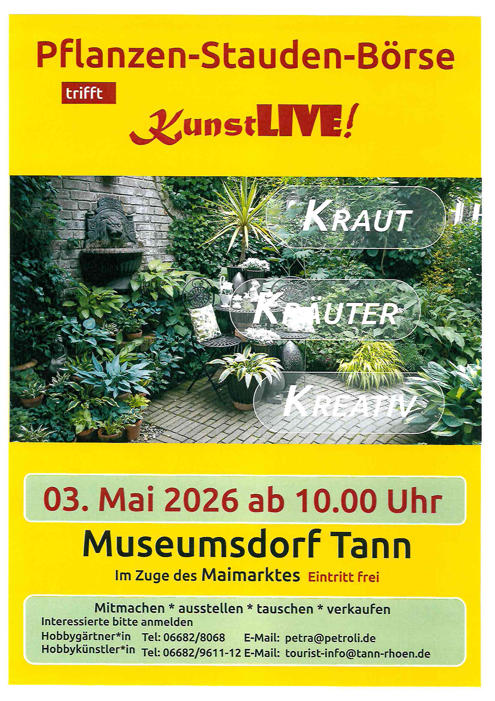 Stauden- und Pflanzenbörse „Kraut-Kräuter-Kreativ“ und Künstlerschau „KunstLive“ im Tanner Freilichtmuseum am 03.05.2026, 10.00-17.00 Uhr