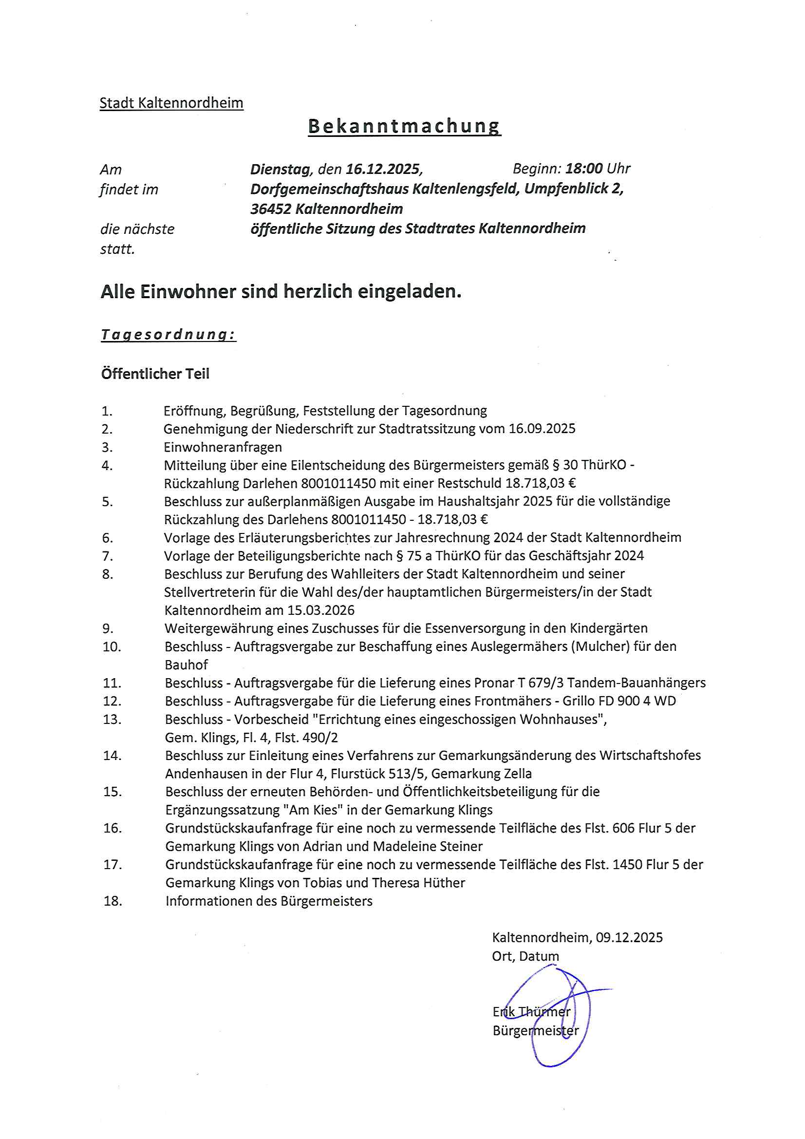 8. Stadtratssitzung am 16.12.2025 Einladung